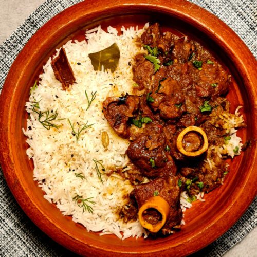Pictured here, we have served Laal Maas with organic dill-infused long-grain basmati rice cooked in bone broth, a pinch of pink salt, green cardamom and a bay leaf sprinkled with sesame seeds and our secret spice blend.Nutrition