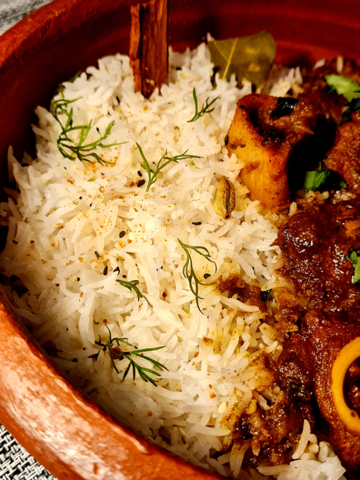 Pictured here, we have served Laal Maas with organic dill-infused long-grain basmati rice cooked in bone broth, a pinch of pink salt, green cardamom and a bay leaf sprinkled with sesame seeds and our secret spice blend.Nutrition
