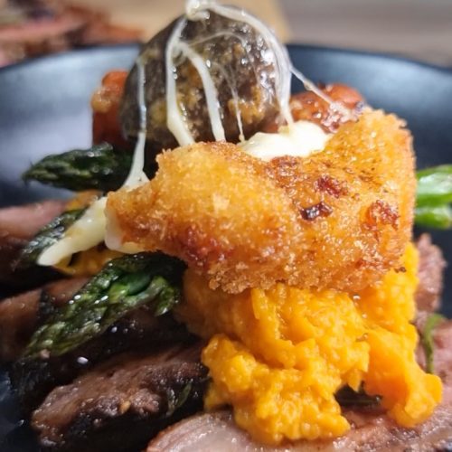 - On each individual plate add slices of steak first, then some sweet mash, some asparagus, carrots, mushroom and then mac and cheese ball, then on top drizzle the jus from the steak.