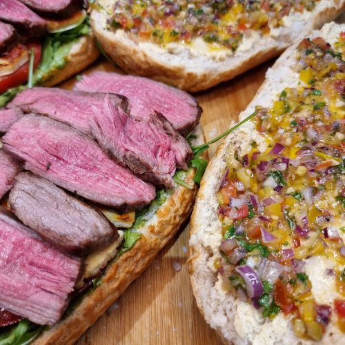 - Assemble your plate with a base of Bread, Pesto, Wild Rocket, Beef Tomatoes, Halloumi then steak slices. Top off the soft warm bread with creamy houmous, and then add a spread of salsa. Put that on top to close the sandwich.
